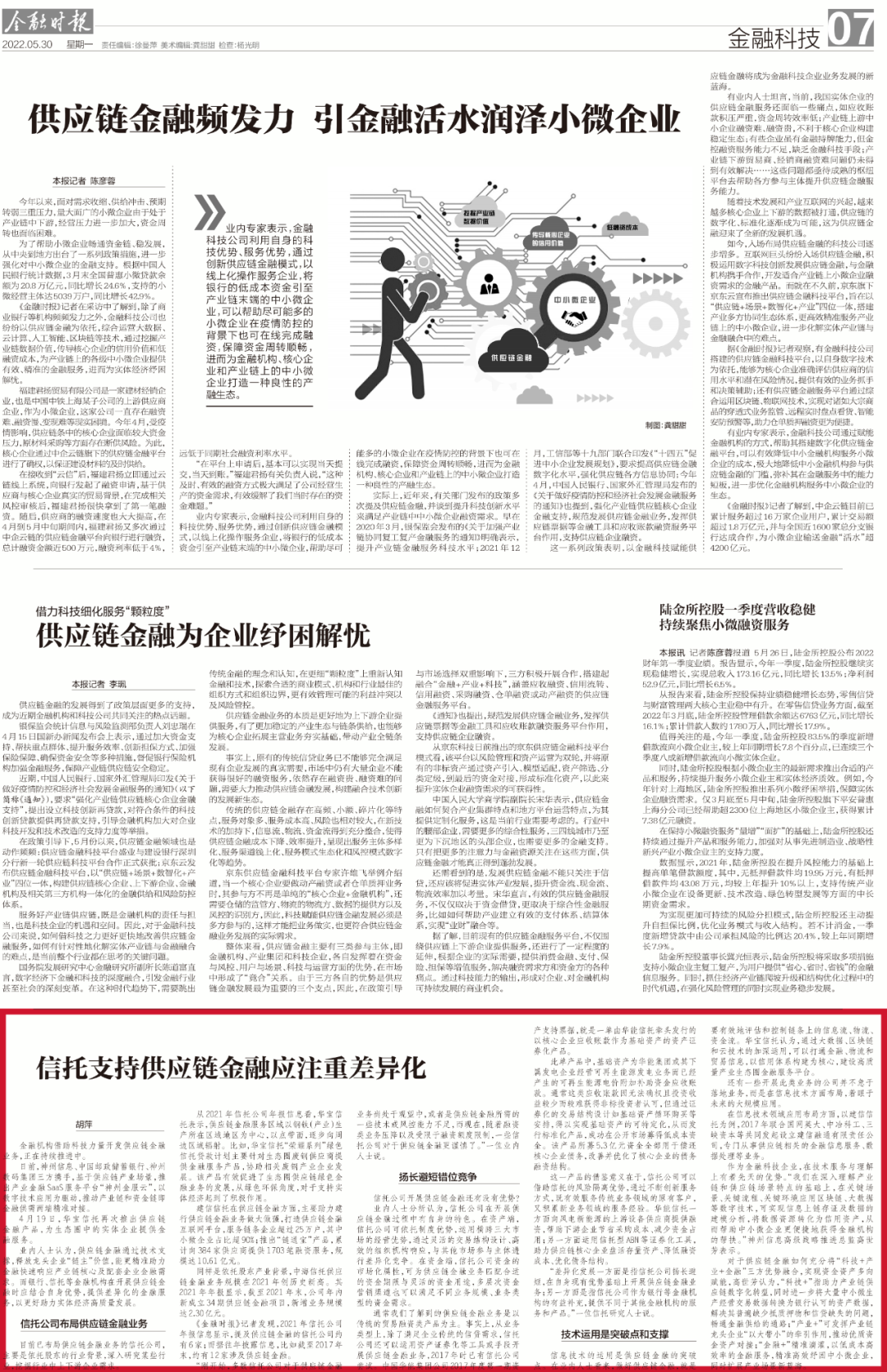 业内人士认为,供应链金融通过技术支撑,释放龙头企业“链主”价值,能更精准助力金融快速响应产业链核心及配套企业金融需求。而银行、信托等金融机构在开展供应链金融时应结合自身优势,提供差异化的金融服务,以更好助力实体经济高质量发展。
